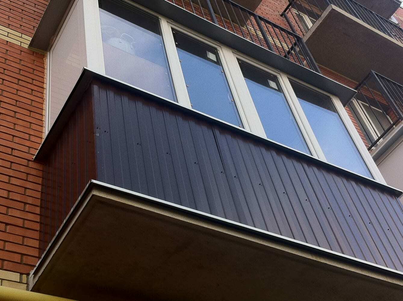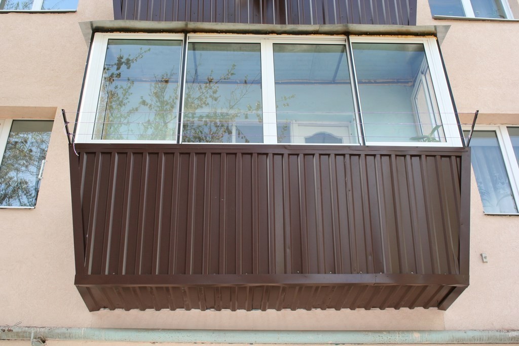 Крепеж навесных элементов к направляющим осуществляется посредством кровельного самореза соответствующего цвета длиной 29 или 35 мм. Если металлическое ограждение выпирает за плоскость фасада в сторону улицы и под ним отсутствует карниз соседей или балкон, снизу образуется зазор между металлом и бетонной плитой, в котором видна внутренняя балконная отделка. Исполнитель работ не перекрывает данный зазор и не включает этот вид работ в стоимость отделки фасада. Для перекрытия такого зазора используется «юбка» (фартук). См. раздел Юбка, опорный брус, скамейка.