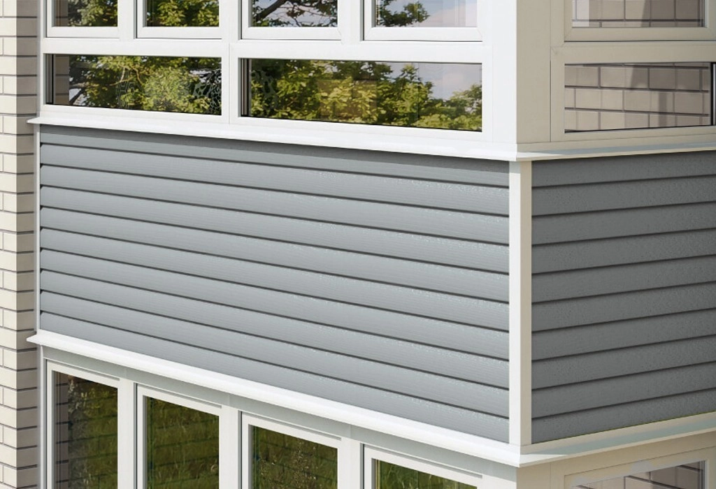 Углы балкона на фасаде могут быть выполнены из двух J-профилей, соединенных между собой, или из элемента сайдинга «наружный угол». Выбор зависит от наличия деталей на складе исполнителя и предпочтений заказчика.