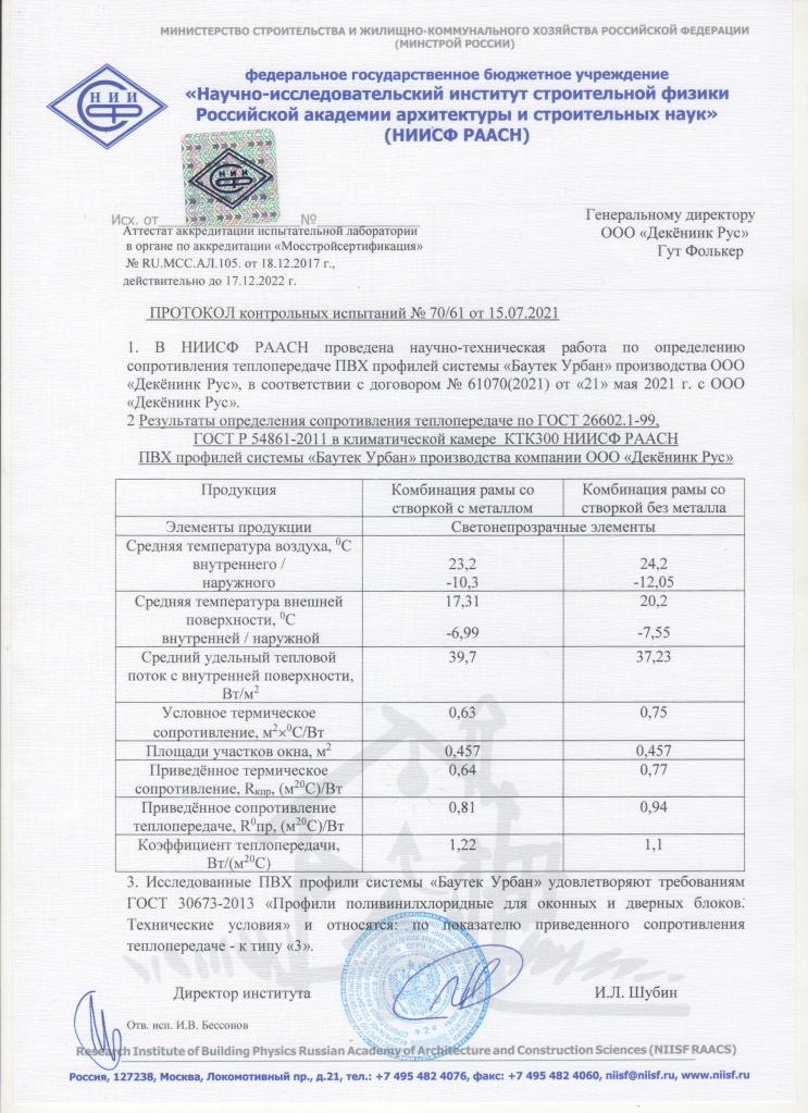 Протокол испытаний №57-486/21 Блоки оконные и блоки дверные из пвх профилей системы Декенинк