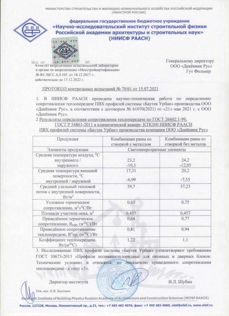Протокол испытаний № 70/61 от 15.07.2021 (теплофизика)